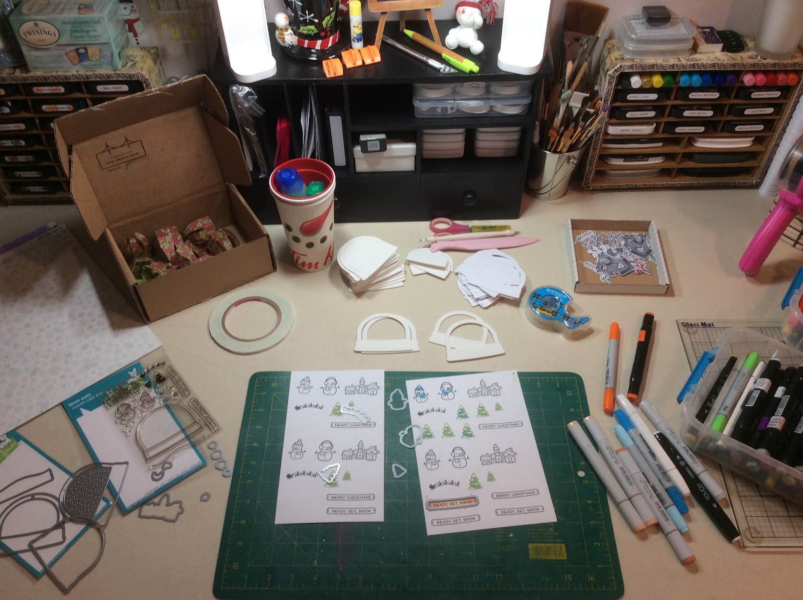 As every year my sister and I make home made gifts for each other and here are the ones I made for her this year. Top hats are made from recycled ribbon spools and the snow globe I used my new die set Ready set snow from Lawm Fawn.